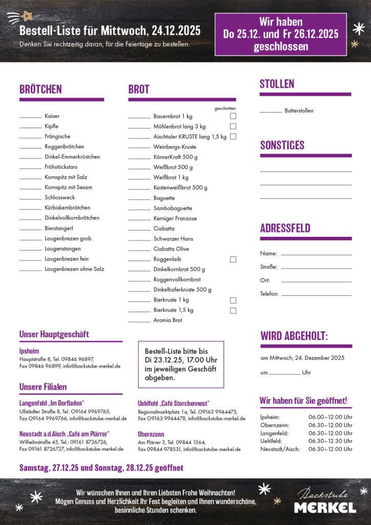 Denken Sie daran, rechtzeitig für die Feiertage zu bestellen. Hier können Sie das PDF der Bestell-Liste für den 24.12. als PDF runterladen. Abgabe bitte im jeweiligen Geschäft bis Dienstag, den 23.12. um 17.00 Uhr. Die Listen liegen auch in den Filialen aus.