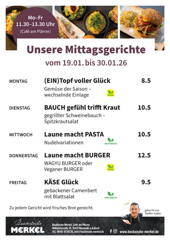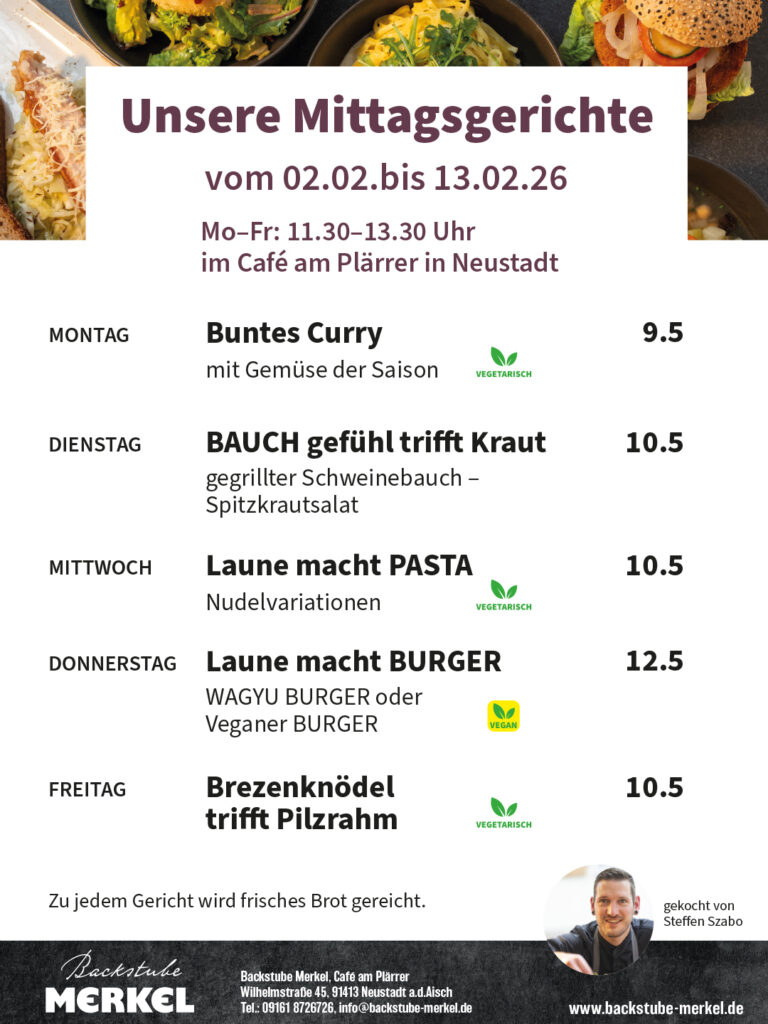 Kommen Sie ins Café am Plärrer und lassen Sie sich von den warmen Speisen von Steffen Szabo begeistern. Immer montags bis freitags zwischen 11:30 und 13:30 Uhr bei uns in Neustadt.
